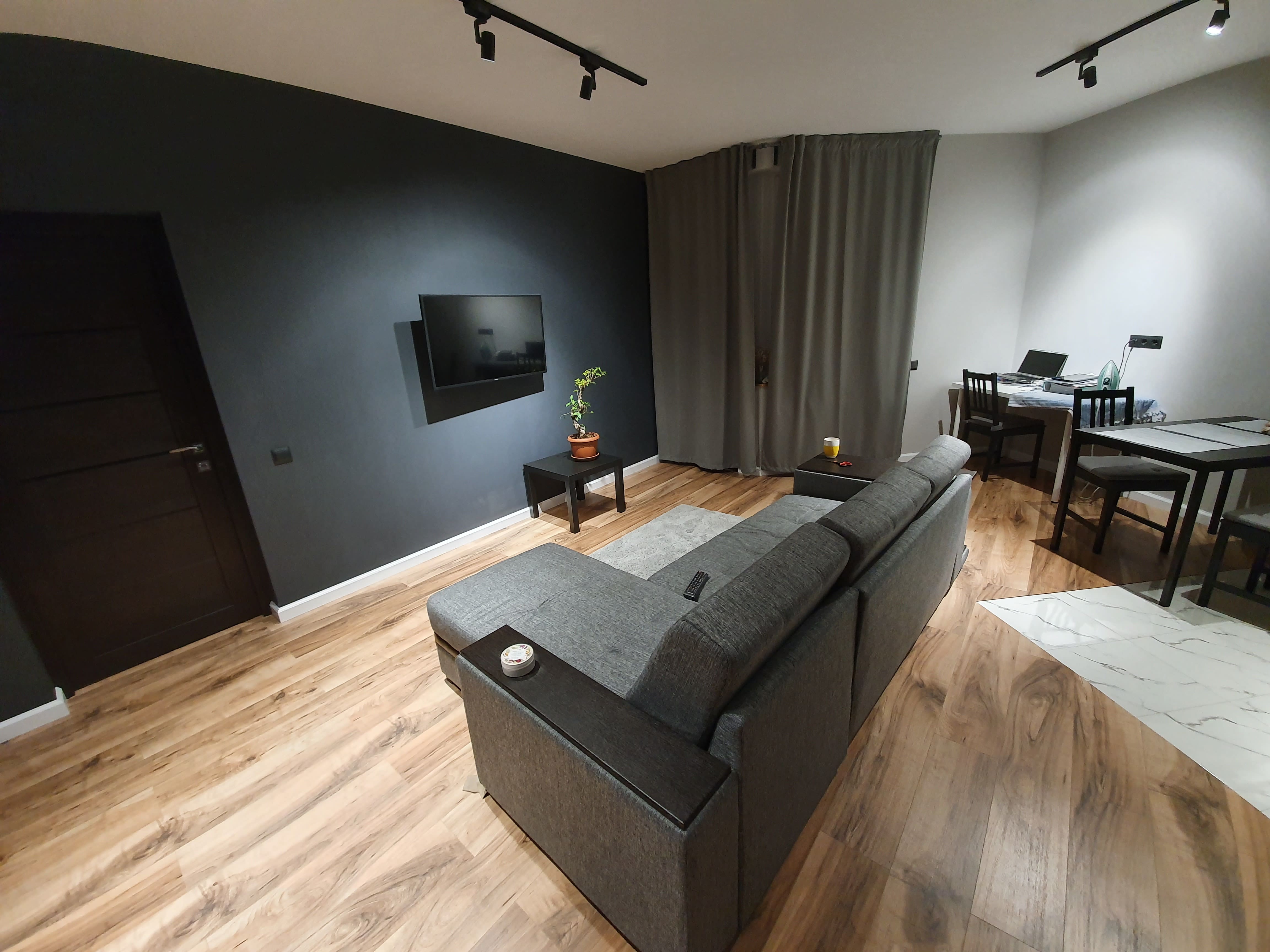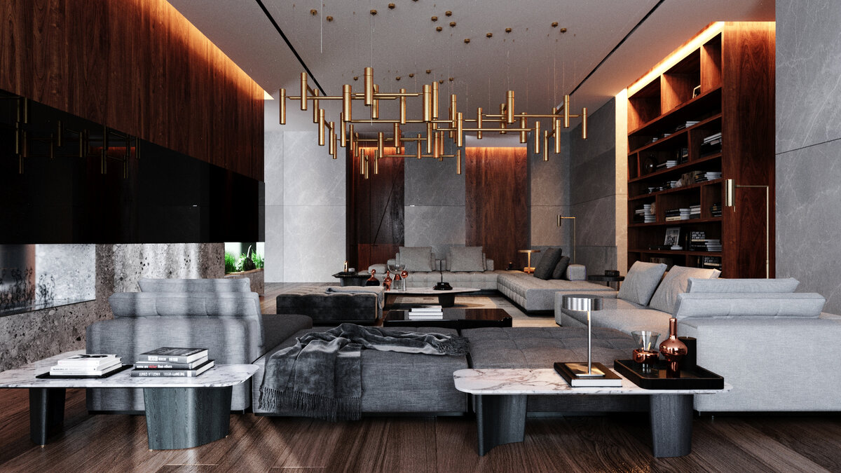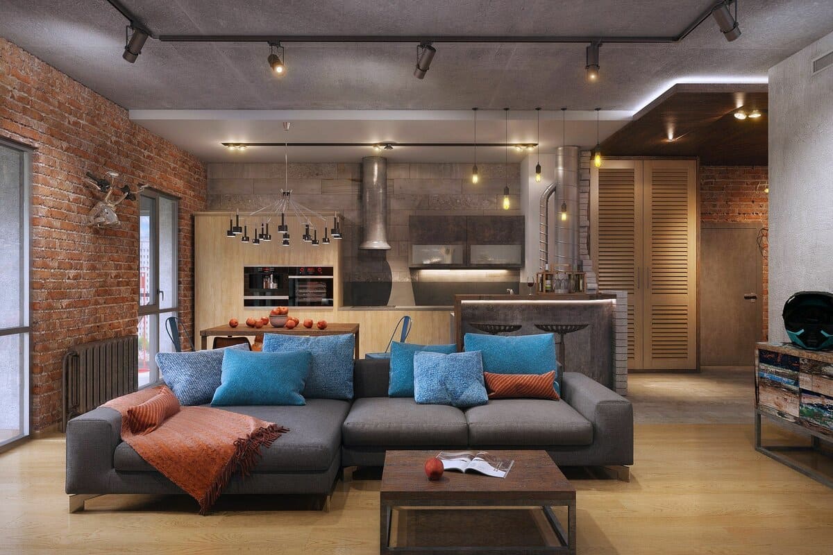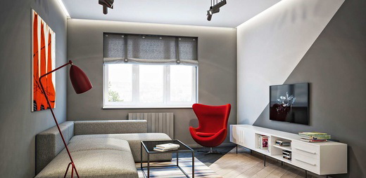 Много пространства, функциональная мебель. Доминирует насыщенный серый цвет, на его фоне выгодно смотрится красный, двухуровневая покраска стены в гостиной, прямые линии и минимум декора – все это выражено в современном стиле. Заниженная мягкая мебель простых форм в тон стенам. Светильники стилистические разные, но хорошо сочетаются друг с другом. Очень стильное и яркое решение. Этот стиль подходит для тех, кто ценит уют и комфорт, красоту и гармонию.